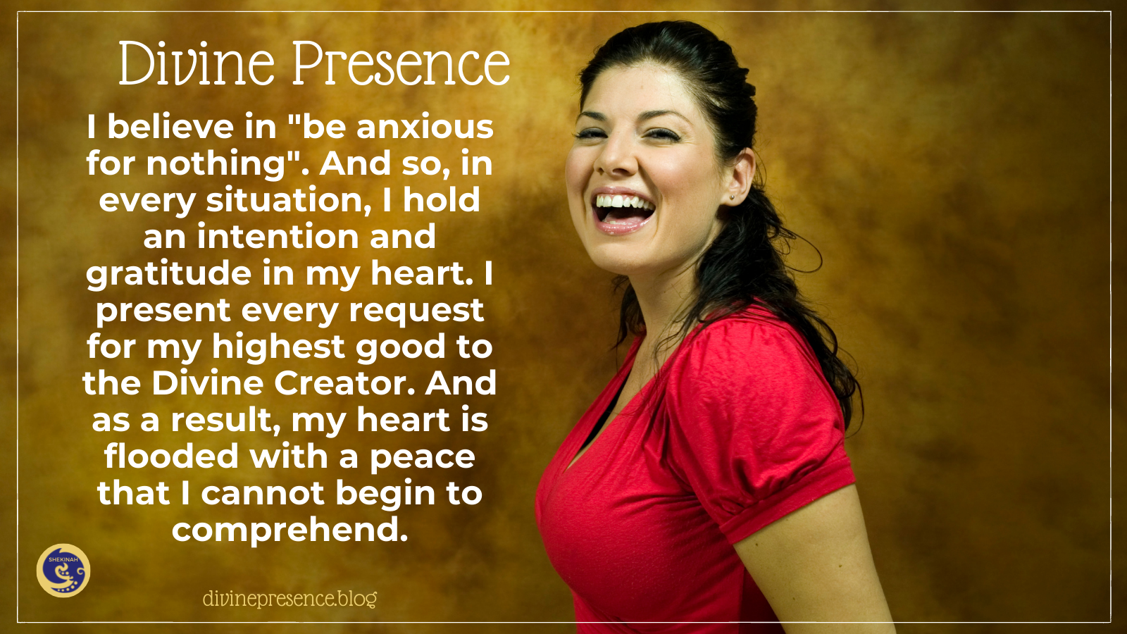 I believe in “be anxious for nothing”. And so, in every situation, I hold an intention and gratitude in my heart. I present every request for my highest good to the Divine Creator. And as a result, my heart is flooded with a peace that I cannot begin to comprehend.